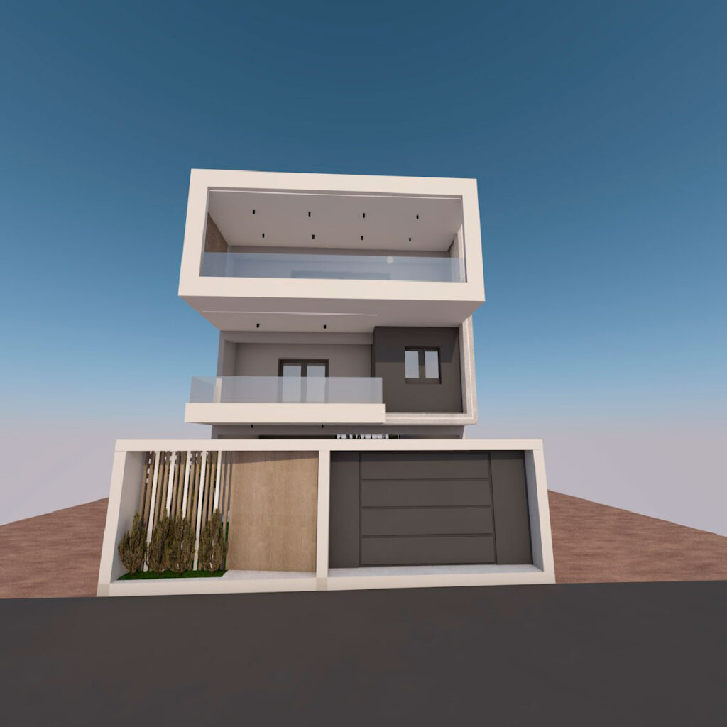 Το κτίριο αποπνέει μια σύγχρονη και minimal αισθητική, με καθαρές γεωμετρικές γραμμές και έναν αρμονικό συνδυασμό όγκων. Ο σχεδιασμός χαρακτηρίζεται από ασύμμετρες μορφές και δυναμικές προεξοχές που δημιουργούν μια αίσθηση κίνησης και μοντέρνας αρχιτεκτονικής έκφρασης. Η χρωματική παλέτα αποτελείται από λευκές και σκούρες επιφάνειες, οι οποίες ενισχύουν την αντίθεση και αναδεικνύουν τον λιτό και κομψό χαρακτήρα του κτιρίου. Οι μεγάλες γυάλινες μπαλκονόπορτες και τα διαφανή κιγκλιδώματα προσδίδουν αίσθηση ελευθερίας και διαφάνειας, επιτρέποντας τη μέγιστη εκμετάλλευση του φυσικού φωτός. Το τοπίο γύρω από το κτίριο είναι διαμορφωμένο με φυτεύσεις από κυπαρίσσια, τα οποία προσθέτουν ένα φυσικό στοιχείο που εξισορροπεί τη σύγχρονη αισθητική. Η περίφραξη με οριζόντιες ξύλινες γραμμές συμβάλλει στη δημιουργία ενός ζεστού και φιλόξενου περιβάλλοντος, ενώ η υψομετρική διαφοροποίηση του οικοπέδου ενισχύει την επιβλητικότητα της κατασκευής.