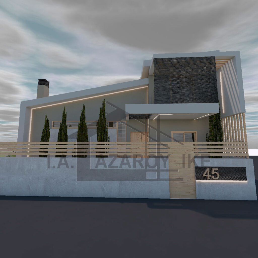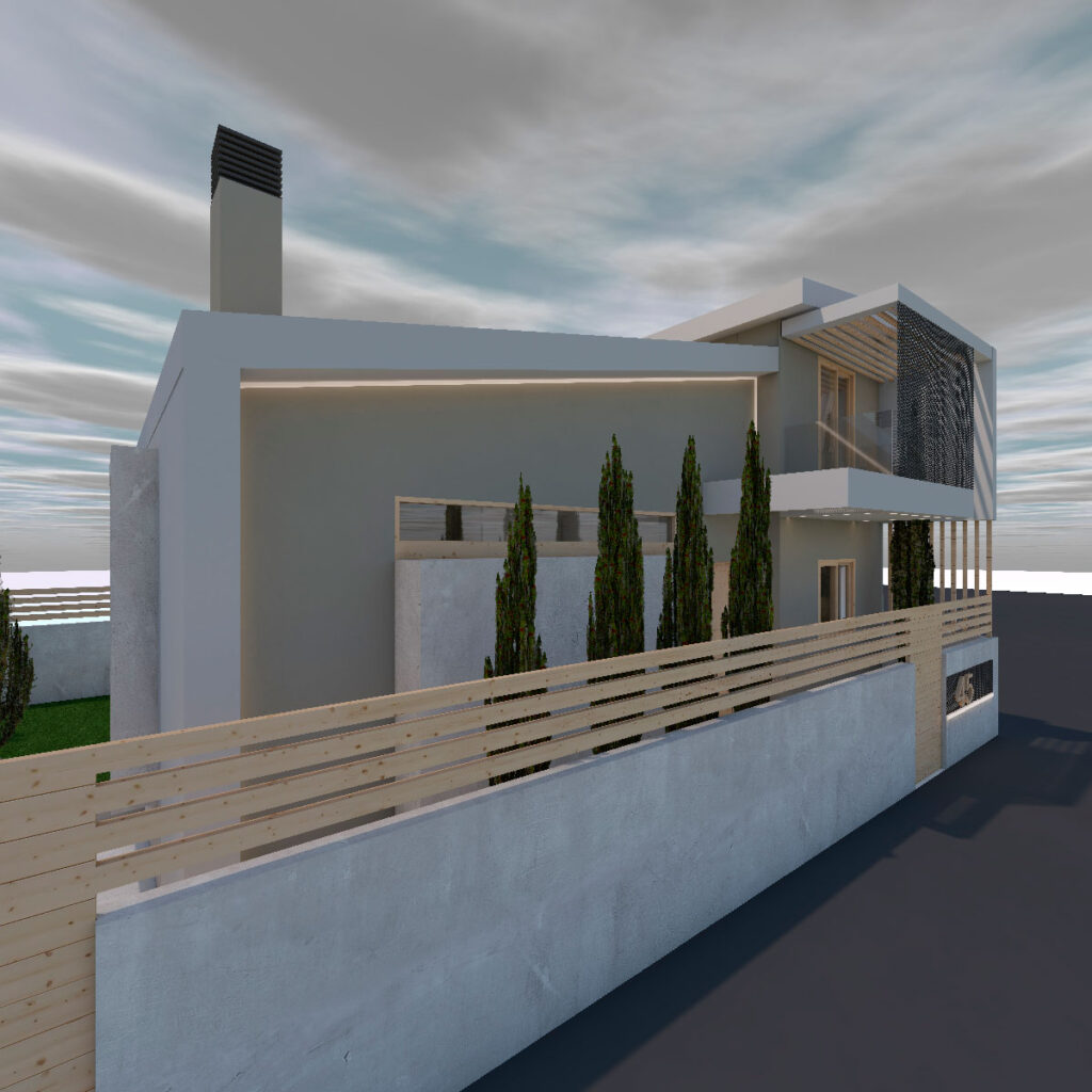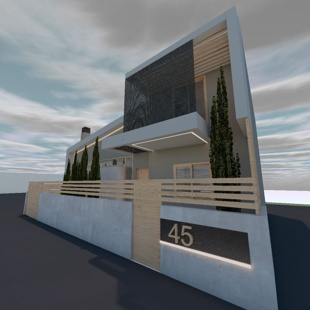 Το κτίριο αποπνέει μια σύγχρονη και minimal αισθητική, με καθαρές γεωμετρικές γραμμές και έναν αρμονικό συνδυασμό όγκων. Ο σχεδιασμός χαρακτηρίζεται από ασύμμετρες μορφές και δυναμικές προεξοχές που δημιουργούν μια αίσθηση κίνησης και μοντέρνας αρχιτεκτονικής έκφρασης. Η χρωματική παλέτα αποτελείται από λευκές και σκούρες επιφάνειες, οι οποίες ενισχύουν την αντίθεση και αναδεικνύουν τον λιτό και κομψό χαρακτήρα του κτιρίου. Οι μεγάλες γυάλινες μπαλκονόπορτες και τα διαφανή κιγκλιδώματα προσδίδουν αίσθηση ελευθερίας και διαφάνειας, επιτρέποντας τη μέγιστη εκμετάλλευση του φυσικού φωτός. Το τοπίο γύρω από το κτίριο είναι διαμορφωμένο με φυτεύσεις από κυπαρίσσια, τα οποία προσθέτουν ένα φυσικό στοιχείο που εξισορροπεί τη σύγχρονη αισθητική. Η περίφραξη με οριζόντιες ξύλινες γραμμές συμβάλλει στη δημιουργία ενός ζεστού και φιλόξενου περιβάλλοντος, ενώ η υψομετρική διαφοροποίηση του οικοπέδου ενισχύει την επιβλητικότητα της κατασκευής.